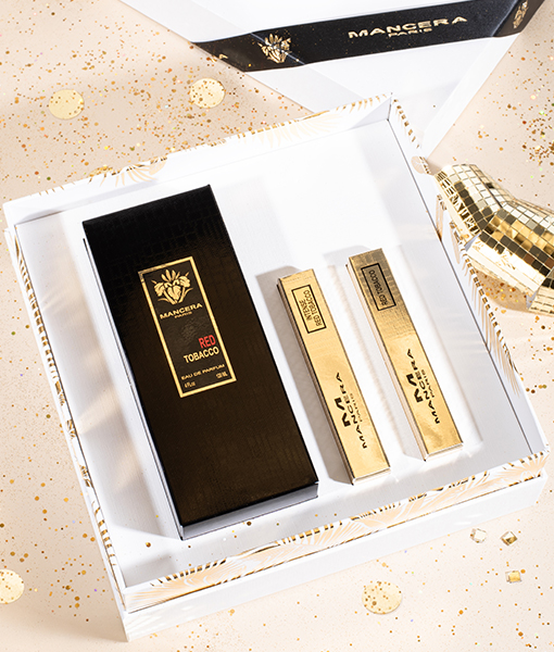 Un elegante cofanetto Natalizio Mancera contenente un Red Tobacco 120 ml + 2 mini-taglia da 8 ml con astuccio (Red Tobacco 8 ml ed Intense Red Tobacco 8 ml)